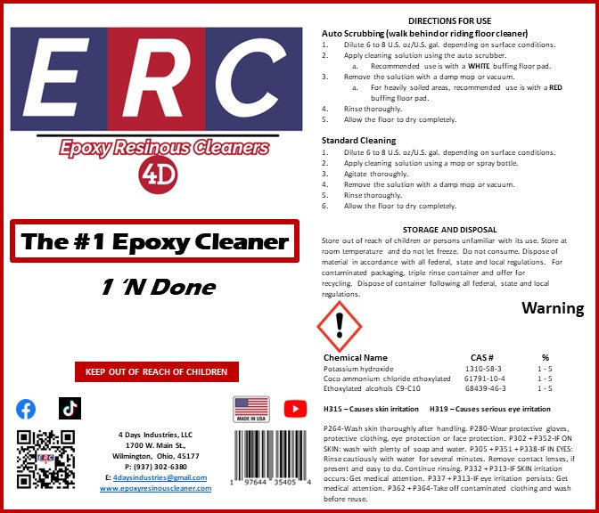 The best cleaner for Epoxy Garage Floors! 1 'N Done is designed as a single use total epoxy garage floor cleaner. This cleaner is the best way to remove stains and dirt from any epoxy garage floor and keep the original luster and shine of your garage floor. Easy to use and effective on all epoxy garage floors.